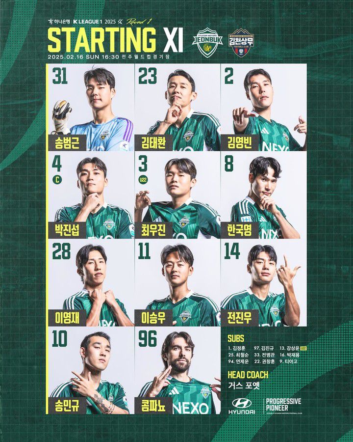 2025시즌 개막전을 맞아 전북은 안드레아 콤파뇨를 필두로 송민규, 전진우, 이승우, 이영재, 한국영, 최우진, 박진섭, 김영빈, 김태환, 골키퍼 송민규가 선발 출전했다.