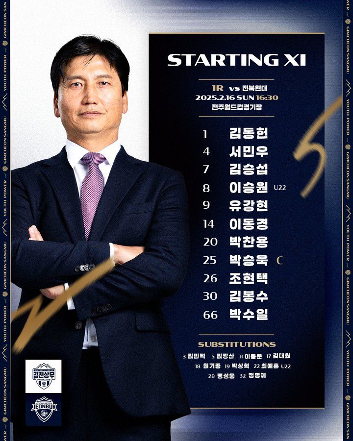 이에 맞선 김천은 유강현을 비롯해 이동경, 이승원, 김봉수, 서민우, 김승섭, 박수일, 박승욱, 박찬용, 조현택, 골키퍼 김동헌이 스타팅 라인업에 이름을 올렸다.
