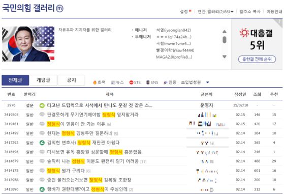 윤 대통령 지지 온라인 커뮤니티인 디시인사이드 '국민의힘 갤러리'에는 최근 정형식 헌법재판관에 대한 비판 글이 올라오고 있다. 사진 디시인사이드 홈페이지 캡처 |
