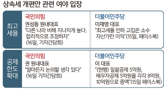 국민의힘은 민주당에 상속세 공제 한도 확대 논의를 시작하자고 압박했다. 권 원내대표는 “상속세율 인하 이전에라도 민주당이 공제 한도를 확대하자는 부분에 대해서는 얼마든지 논의할 생각을 가지고 있다”고 말했다.