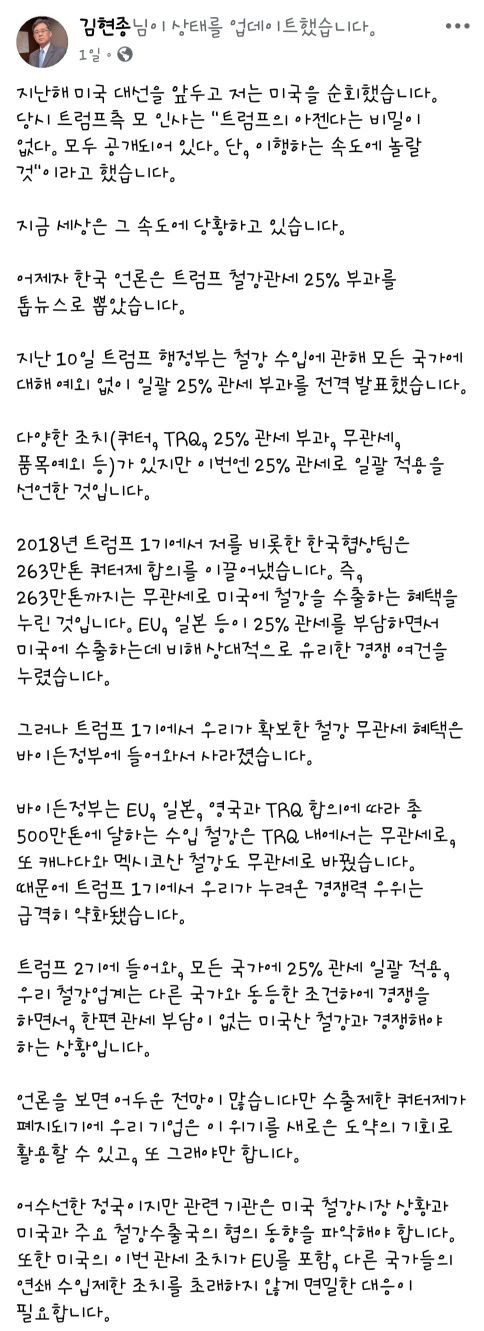 김 전 본부장은 지난 23일 본인의 페이스북을 통해 “지난 10일 트럼프 행정부는 철강 수입에 관해 모든 국가에 대해 예외 없이 일괄 25% 관세 부과를 전격 발표했다. 다양한 조치(쿼터, TRQ, 25% 관세 부과, 무관세, 품목예외 등)가 있지만 이번엔 25% 관세로 일괄 적용을 선언한 것”이라고 이같이 밝혔다.