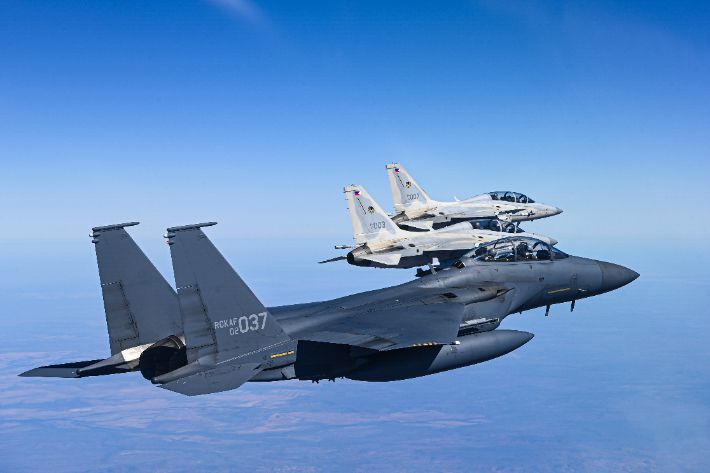 지난해 7월 31일 호주 다윈기지 상공에서 피치블랙 훈련에 참여한 한국 공군 F-15K와 필리핀 공군 FA-50PH가 우정 비행하고 있다. 공군 제공
