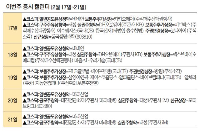 공모주 청약도 예정돼 있다. 이차전지 공정용 소재 기업인 대진첨단소재는 20~21일 일반청약을 거쳐 다음달 6일 코스닥 시장에 상장할 예정이다. 아직 기관투자자 수요예측 결과는 공개되지 않았다. 희망 공모가 밴드는 1만900~1만3000원이며 총 공모 예정 금액은 약 327억∼390억원이다.