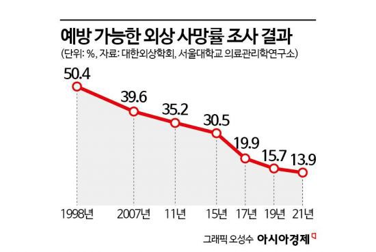 2014년부터 전국 각 지역을 책임지는 권역외상센터가 지정된 이후 우리나라의 '예방 가능한 외상 사망률'은 2011년 35.2%에서 2021년 13.9%까지 절반 이하로 낮아졌다. 권역의료센터란 교통사고나 추락 등에 의한 다발성 골절, 출혈 등을 동반한 중증외상 환자가 병원 도착 즉시 응급수술이 가능하고 최적의 치료를 받을 수 있도록 준비된 외상 전용 치료센터를 말한다. 외상으로 인한 전체 사망자 중 적절한 시간 내에 적정 치료가 가능한 병원으로 이송돼 치료받았다면 생존할 수 있었을 것으로 추정되는 사망자의 비율이 크게 줄었다는 것은 외상센터에 충분한 시설과 장비, 인력이 확보된다면 얼마든지 사망률을 낮출 수 있다는 방증이다.