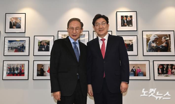 권성동 국민의힘 원내대표가 17일 오전 서울 서초구 이명박재단 사무실을 찾아 이명박 전 대통령과 기념촬영하고 있다.