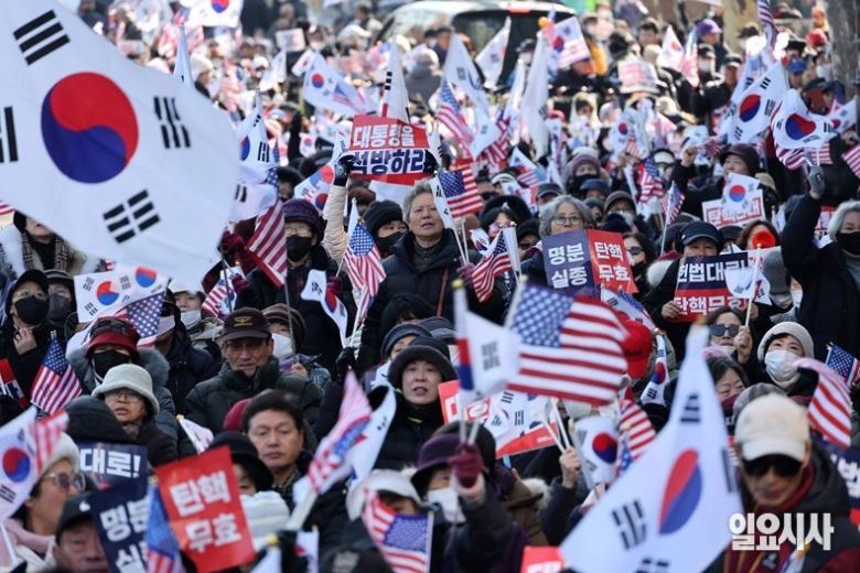 지난달 23일, 서울 헌법재판소 인근서 윤석열 대통령의 탄핵 반대를 주장하며 집회 중인 윤 대통령 지지자들 ⓒ사진공동취재단