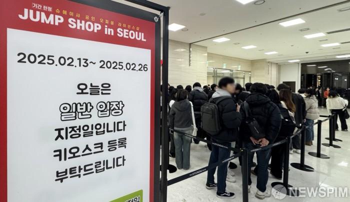 [서울=뉴스핌] 이형석 기자 = 17일 오전 서울 여의도 더현대 서울에 마련된 점프샵 인 서울 팝업스토어를 찾은 시민들이 입장을 위해 줄을 서 있다. 점프샵 인 서울 팝업스토어에서는 주간 소년 점프의 인기 캐릭터를 만나 볼 수 있다. 2025.02.17 leehs@newspim.com