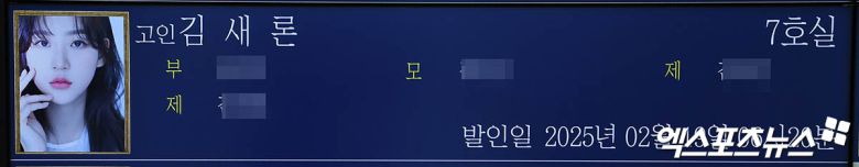 (엑스포츠뉴스 박지영 기자) 갑작스럽게 세상을 떠난 故 김새론의 빈소가 17일 서울 송파구 서울아산병원 장례식장에 마련됐다.