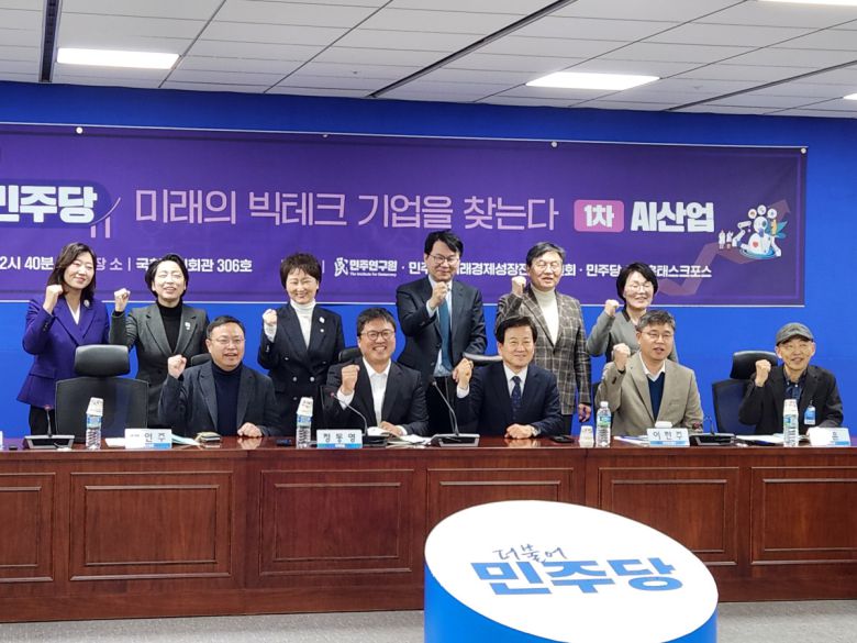 17일 더불어민주당이 '성장은 민주당, 미래의 빅테크 기업을 찾는다: AI산업'을 주제로 개최한 미래 산업 경청 간담회에서 참석자들이 기념사진을 촬영하고 있다.
