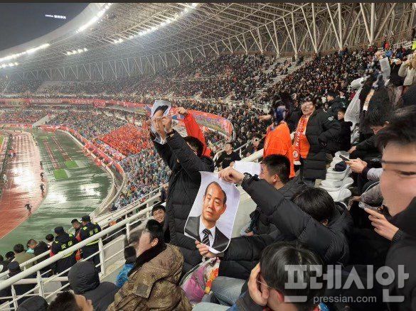 지난 11일 중국 산둥성 올림픽스포츠센터에서 열린 2024~2025 아시아챔피언스리그 7차전 광주 FC와 산둥 타이산의 경기 중 일부 산둥 팬들이 광주 FC 팬들을 향해 전두환 사진을 펼친 부적절한 행동을 했다.