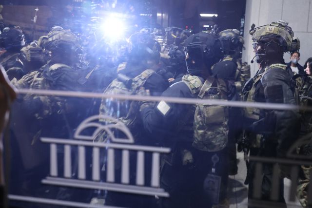 ▲윤석열 대통령이 지난해 12월 3일 밤 비상계엄을 선포한 가운데 4일 자정께 서울 영등포구 여의도 국회 본관으로 계엄군이 진입 준비를 하고 있다. ⓒ연합뉴스 |