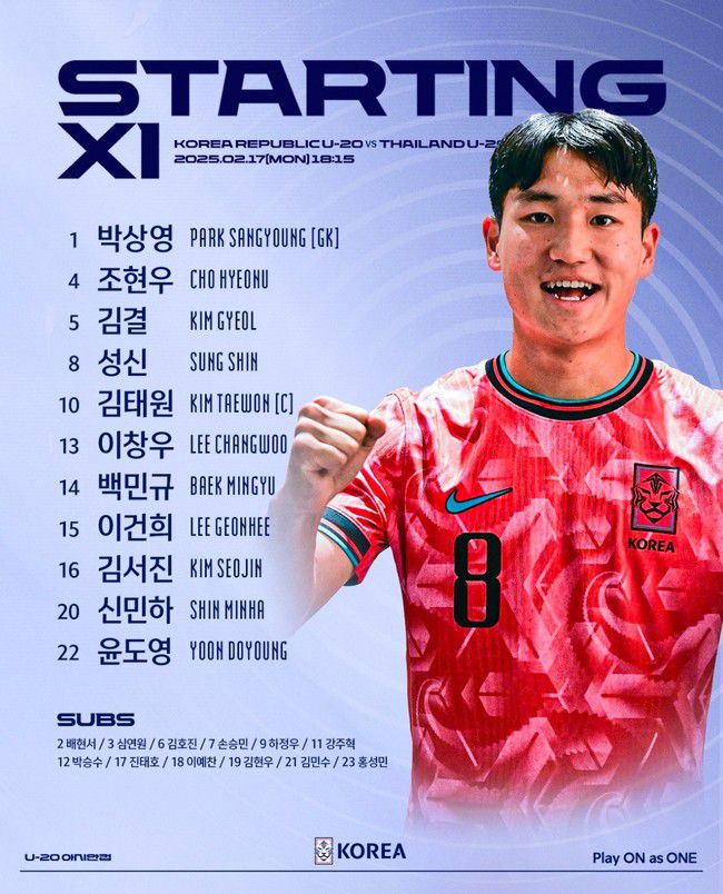 이창원 감독이 지휘하는 20세 이하(U-20) 한국 대표팀은 14일 오후 6시 15분 중국 선전의 유소년 축구 트레이닝 베이스 1구장에서 2025 아시아축구연맹(AFC) U-20 아시안컵 조별리그 D조 2차전 태국을 상대로 4-1 승리를 거뒀다. 이로써 한국은 승점 6점을 선취하며 8강 진출을 확정지었다.