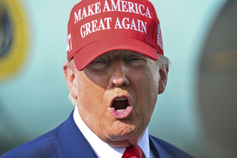 도널드 트럼프 미국 대통령이 현지 시각으로 16일 미 플로리다주 팜비치 국제공항에 도착해 취재진에게 발언하는 모습. [AP]