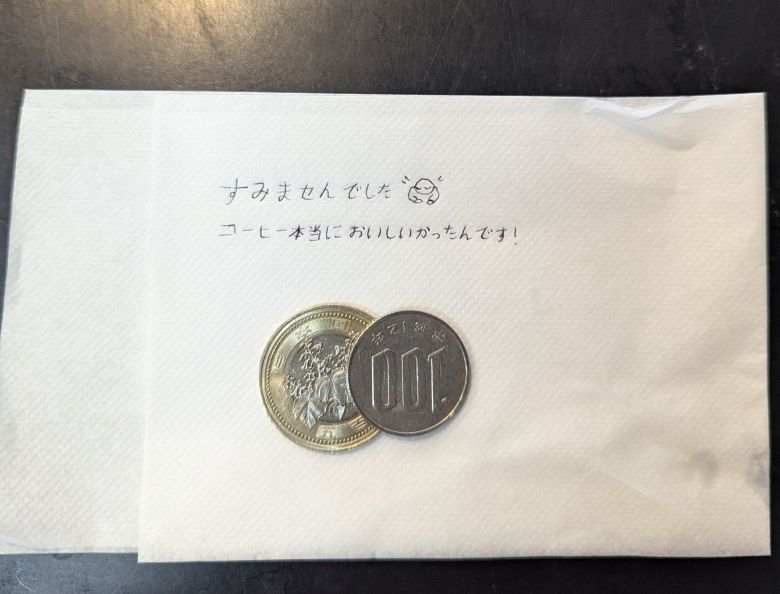 동전은 음료 한 잔 가격인 600엔(약 5700원)이었다. 휴지에는 “죄송했습니다. 커피 정말 맛있었어요!”라는 글귀가 일본어로 쓰여 있었다. 음료를 쏟았던 손님이 A씨 호의로 제공받은 음료 값을 추가로 남기고, 감사 인사까지 덧붙인 것이었다.