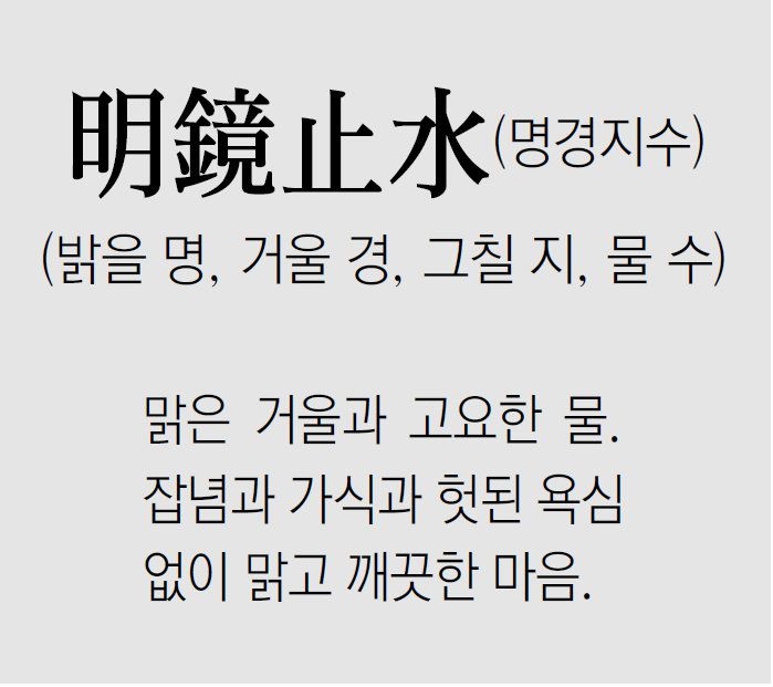 ● 생각거리: 명경지수(明鏡止水)는 외적인 상황에 흔들리지 않고 자신의 생각과 감정을 명확하게 깨닫는 것으로, 단순히 마음의 평온함을 넘어서 자신의 내면을 깊이 성찰하는 것을 의미합니다.