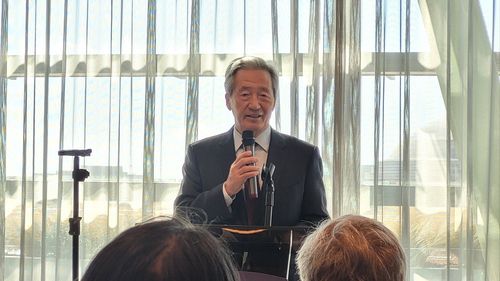 (워싱턴=연합뉴스) 김동현 특파원 = 정몽준 아산정책연구원 명예이사장이 17일(현지시간) 워싱턴DC의 존스홉킨스대 국제관계대학원(SAIS)에서 '정몽준 안보학 석좌교수직' 설립 기념 연설을 하고 있다. 2025.2.17