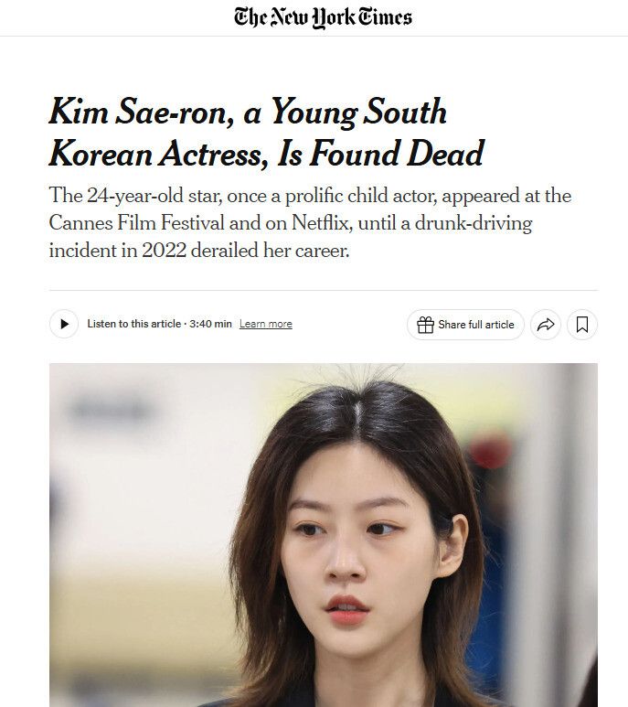 뉴욕타임스는 “한국에서 가장 칭송받는 젊은 배우 가운데 하나였던 김새론은 음주운전으로 유죄 판결을 받은 뒤 대중적 비판에 직면한 뒤로 어떤 쇼(작품)에도 출연하지 않았다”고 소개하며 “전문가들은 ‘(한국) 유명인들의 인기는 종종 흠잡을 데 없는 평판에 달려있다’라고 말한다”고 덧붙였다.