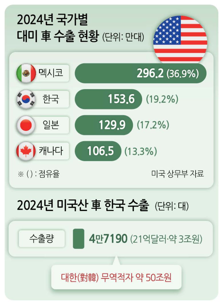 ▶‘사실상 수입 1위국’ 한국 완성차 집중 공격…“협상 통해 정책 불확실성 줄여야”=트럼프 정부가 30%대의 세금이 붙는 EU산 자동차를 제쳐두고 10%대의 한국 자동차를 집중 타격하는 이유는 국내 업계가 사실상 대미 자동차 수출 1위에 올라있기 때문으로 분석된다. 미 상무부에 따르면 지난해 미국이 수입한 자동차 802만대 중 한국산은 154만대로 전체 국가 중 2위에 올라 있다.