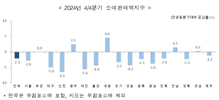 역대 처음으로 지난해 전국 17개 모든 시도에서 연간 소매판매가 전년대비 감소했다. 고물가·고금리에 12·3 비상계엄까지 맞물린 여파다.