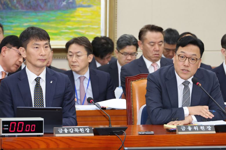 김병환 금융위원장이 18일 국회 정무위원회 전체회의에서 위원 질의에 답변하고 있다. 왼쪽은 이복현 금융감독원장. [연합] |