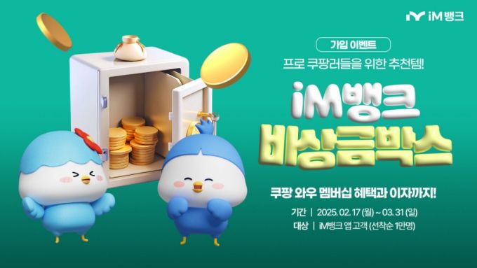 iM(아이엠)뱅크가 수시입출금식 파킹통장 '비상금박스'를 개편하고 가입자에게 쿠팡 '와우 멤버십' 구독료를 환급(캐시백)하는 이벤트를 실시한다.