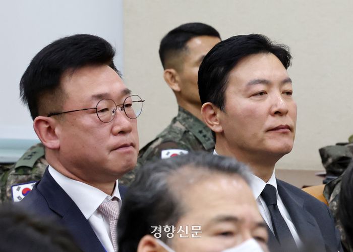김성훈 대통령 경호처 차장(오른쪽)과 이광우 안전본부장이 22일 국회에서 열린 윤석열정부의 비상계엄선포를 통한 내란혐의 진상규명 국정조사특별위원회 청문회에서 무거운 표정으로 의원질의를 듣고 있다. 2025.01.22 박민규 선임기자
