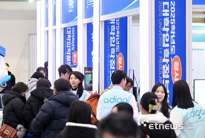 대학입학정보박람회 준비위원회가 주최하고 한국대학교육협의회가 주관한 2025학년도 정시 대학입학정보박람회가 지난해 12월 19일 서울 강남구 코엑스에서 사흘 일정으로 열렸다. 박람회장을 찾은 수험생이 부스 상담을 받고 있다. 김민수기자 mskim@etnews.com