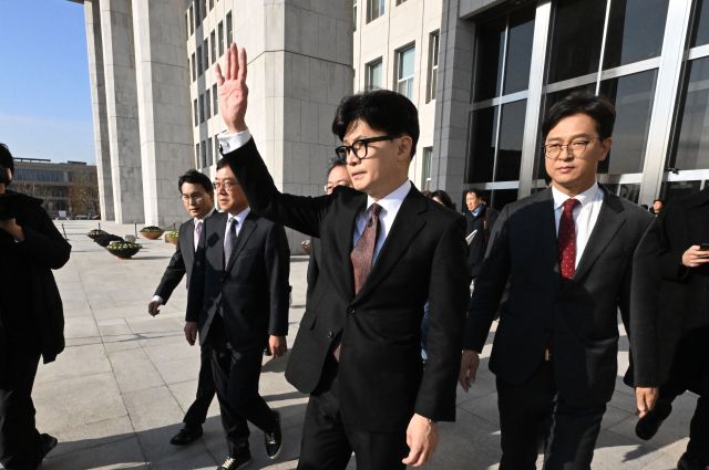 ▲지난해 12월 16일 당 대표 사퇴 의사를 밝힌 국민의힘 한동훈 대표가 국회를 나서며 지지자에게 손을 들어 보이고 있다. ⓒ연합뉴스 |
