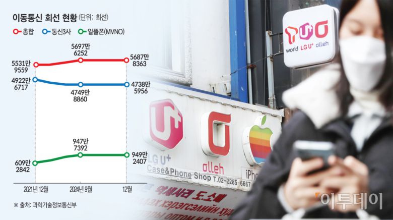 통신3사와 알뜰폰을 합한 이동통신 휴대폰 회선은 △10월 5696만5545 회선 △11월 5695만7096 회선 △12월 5687만8363 회선으로 지난해 4분기 내내 꾸준히 내리막을 걸었다. 전체 통신 회선이 3개월 내내 감소폭을 그린 건 이례적이다.