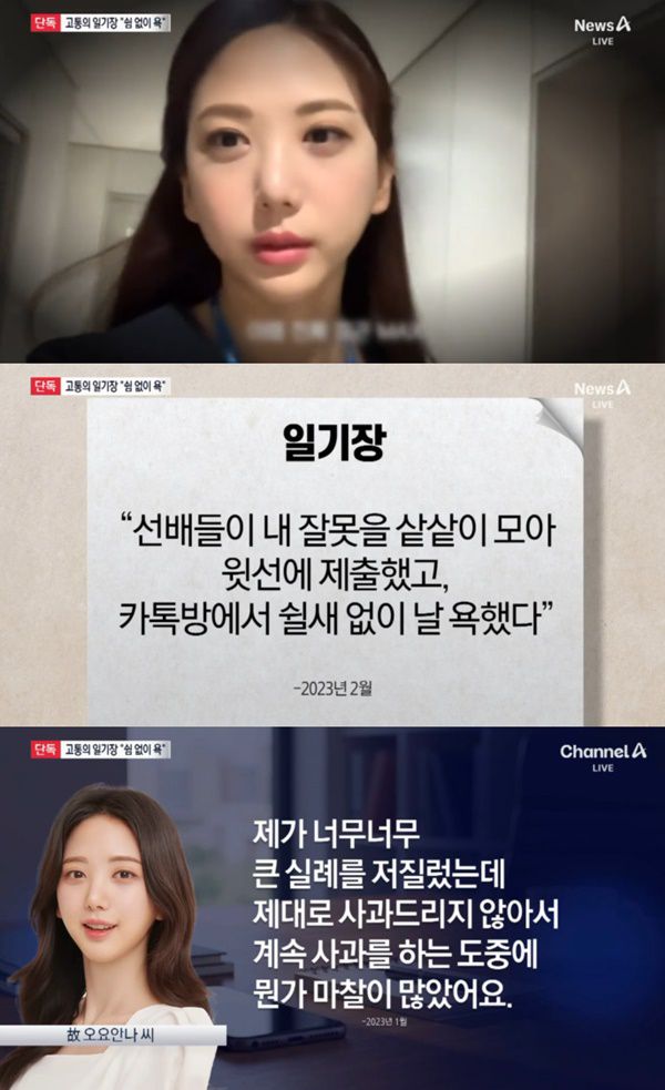 이날 보도된 내용에 따르면 오 씨는 지난 2023년 2월 "선배들이 나의 잘못을 샅샅이 모아 윗선에 제출했고 단체 카톡방에서 쉴 새 없이 날 욕했다"는 내용을 적었다.