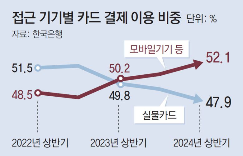 삼성전자와 애플의 본격적인 ‘페이 전쟁’으로 모바일 기기를 이용한 결제는 더욱 확장될 것으로 보인다. 한국은행에 따르면 2023년 모바일기기를 이용한 결제 비중은 실물 카드를 넘어섰고, 2024년 상반기 기준 52.1%에 달한다.
