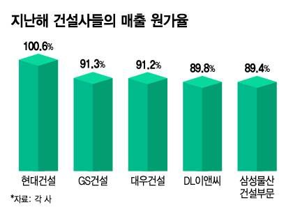 공사비가 치솟자 건설사의 매출에서 원가가 차지하는 비중도 올라갔다. 2020년대 초 80%대였던 건설사들의 매출원가율은 지난해 90% 이상으로 상승했다. 현대건설은 지난해 원가율이 100.6%로 매출보다 비용 규모가 더 컸다. GS건설(91.3%) 대우건설(91.2%)도 원가율이 90%를 넘었다. DL이앤씨(89.8%)와 삼성물산 건설부문(89.4%)도 매출원가율이 90%에 다다랐다.