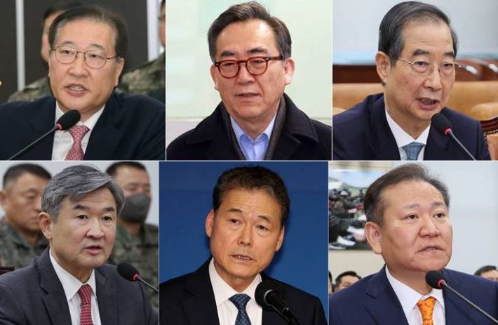 (왼쪽부터 시계방향으로)박성재 법무부 장관·조태열 외교부 장관·한덕수 국무총리·조태용 국정원장·김영호 통일부 장관·이상민 전 행정안전부 장관. 연합뉴스 |