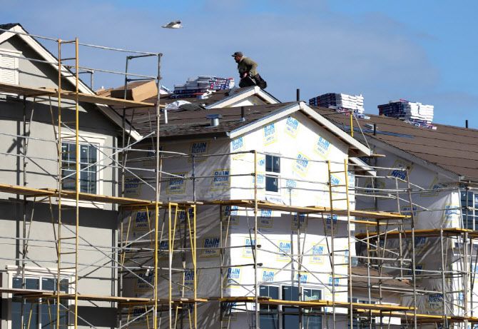 캘리포니아 뉴어크에 있는 레나 브리지웨이 주택 개발 현장에서 한 작업자가 건설 중인 주택을 수리하고 있습니다. (사진=AFP)