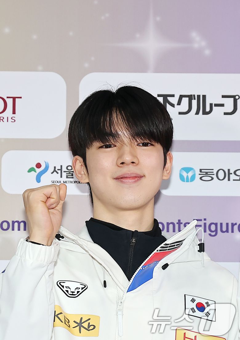 피겨 대표팀 차준환이 18일 오후 서울 양천구 목동 아이스링크 프레스센터에서 열린 2025 ISU 사대륙 피겨스케이팅 선수권대회 한국 선수단 미디어데이에 참석해 기념 촬영을 하고 있다. 2025.2.18/뉴스1 ⓒ News1 김진환 기자
