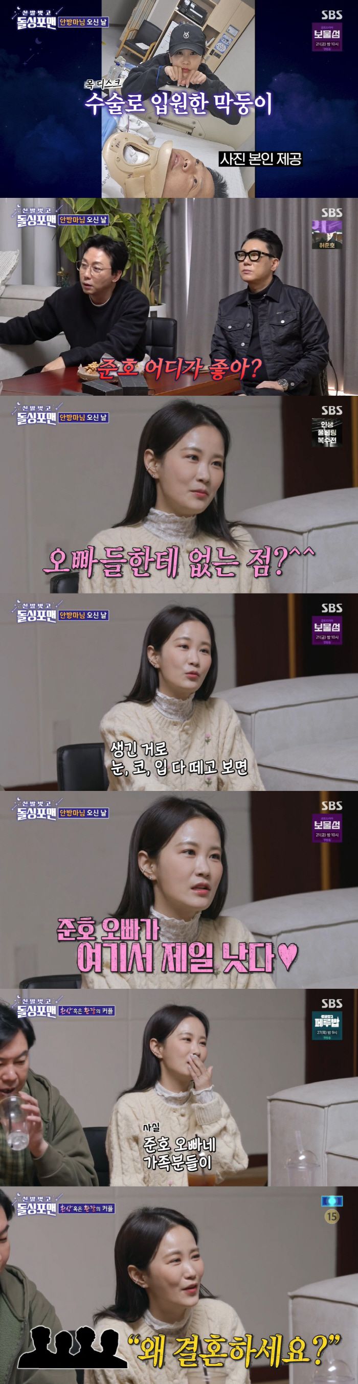 이어 김지민이 "물건을 떨어뜨려 식탁 짚고 줍는데 김준호가 '너무 예뻐서 얼굴인 줄 알았다'면서 팔꿈치에 뽀뽀를 하더라"며 김준호의 로맨틱 면모를 자랑하자, 탁재훈은 "헤어져라. 변태다"고 해 폭소를 안겼다.
