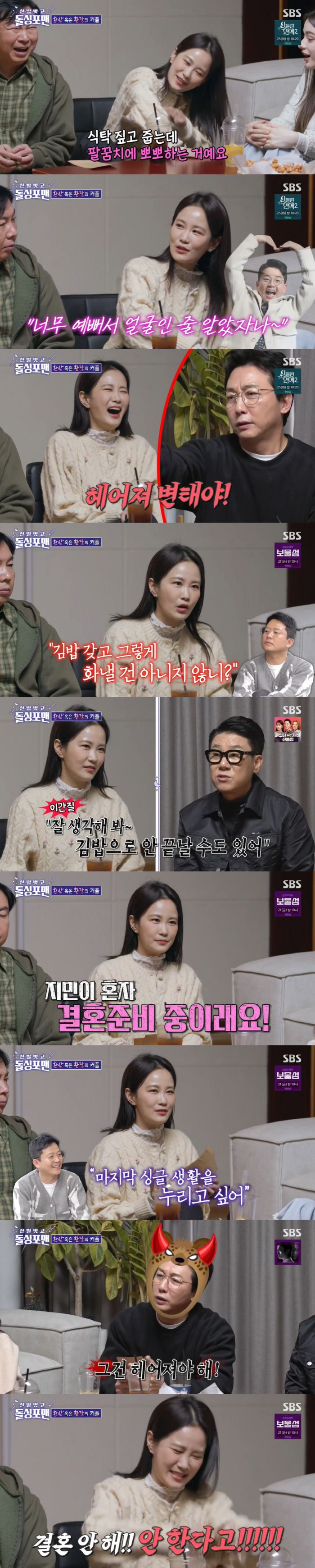 김지민이 최근 김준호와 티격태격한 일화를 털어놓자, 이상민은 "나중에 엄청난 걸로 고집부리다 사고 난다"며 이간질하고 탁재훈은 "헤어져라"며 결혼에 깽판을 쳤다.