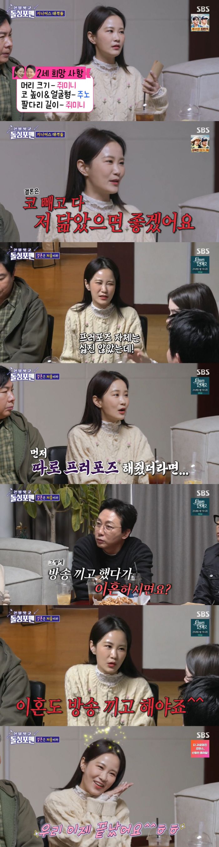 그때 탁재훈은 "방송 끼고 했다가 이혼하게 되면 어떻게 되는 거냐"며 장난을 쳤고, 김지민은 "'우리 이제 끝났어요'라면서 이혼도 방송 끼고 할거다"고 했다. 그러자 이상민은 "어차피 이혼은 모든 채널에서 다룬다"고 해 웃음을 안겼다.