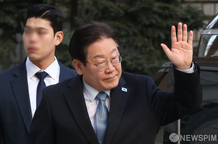 [서울=뉴스핌] 이호형 기자 = 이재명 더불어민주당 대표가 18일 오전 서울 서초구 서울중앙지방법원에서 열린 '대장동 배임 및 성남FC 뇌물 등' 특정범죄가중처벌등에관한법률위반 혐의 1심 속행 공판에 출석하며 지지자를 향해 손 인사를 하고 있다.  2025.02.18 leemario@newspim.com