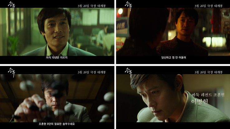 이병헌과 함께 고창석, 현봉식, 문정희, 김강훈까지 연기파 배우들이 예고편에 등장해 영화의 만듦새를 보장한다. 세계 프로바둑 선수권대회 결승에서 우승하며 전국민적 영웅으로 인생 최고의 위치에 서게 된 조훈현(이병헌)이 천재적 감각을 지닌 바둑 신동 이창호(김강훈)를 제자로 받아들이는 과정부터 이후 전설의 라이벌이 된 두 사람의 치열한 대결까지 긴장감 넘치는 전개가 펼쳐진다.