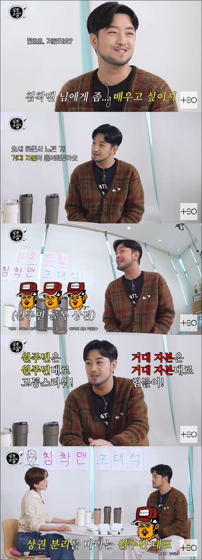 장도연의 칭찬에 침착맨은 "오래는 하고 있는데 앞으로 잘 될지는 모르겠다. 요새 하면서 느낀 게 거대 자본이 들어오지 않았냐. 거대 자본이 들어오면서 힘들어졌다"며 "(유튜브는) 골목상권 아니었냐. 주먹구구식으로 살고 있었는데 원주민들이 살고 있었는데 거대자본들이 들어왔다"고 토로했다.