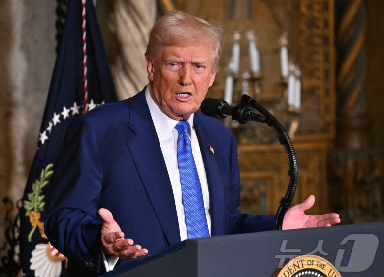 도널드 트럼프 미국 대통령이 18일 (현지시간) 플로리다주 팜비치에 있는 마러라고 자택에서 행정명령 서명식을 마친 뒤 취재진을 만나고 있다. 2025.02.19 ⓒ AFP=뉴스1 ⓒ News1 우동명 기자 |