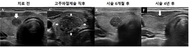 모든 환자에서 고주파절제술이 성공적으로 시행됐으며, 연구팀은 이들의 절제영역(고주파로 괴사된 영역), 암 진행 여부, 부작용, 삶의 질 등을 전향적으로 추적했다. 최대 4.8년 동안 추적한 결과, 절제영역은 시술 후 지속적으로 감소해 최종 추적 관찰 시 전체 환자의 95.9%에서 완전히 사라졌다. 암 진행률은 3%로 대부분의 환자는 암이 커지거나 전이되지 않았다. 부작용으로 1명에게서 일시적인 성대 마비가 발생했으나, 이는 6개월 후 회복됐으며 다른 합병증은 전체 추적 관찰 기간 발생하지 않았다.