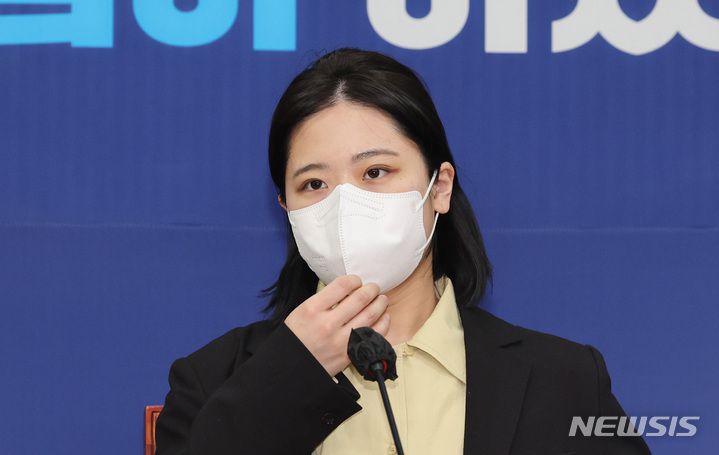 [서울=뉴시스] 최동준 기자 = 박지현 더불어민주당 공동비상대책위원장이 22일 서울 여의도 국회에서 열린 2045 민주당 정치인 연대 '그린벨트'와 민주당 비대위와의 간담회에서 발언하고 있다. (공동취재사진) 2022.03.22. photo@newsis.com