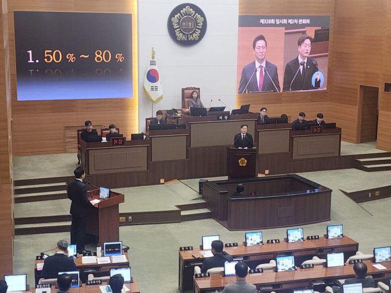 오 시장 발언 뒤 국민의힘 몇명 시의원들은 “오세훈 화이팅”을 외쳤다. 서울시의회는 국민의힘 시의원이 전체 111명 중 75명으로 과반 이상을 차지하고 있다.