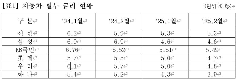 19일 여신금융협회에 따르면 이달 기준 신용카드사 6곳(신한·삼성·KB국민·롯데·우리·하나카드)의 자동차 할부 금리(현대 디 올 뉴 그랜저 선수금 10% 8개월)는 연 3.9~5.49%다. 지난해 동기 대비 하단과 상단이 각각 1.3%포인트(p), 1.41%p씩 하락했다.