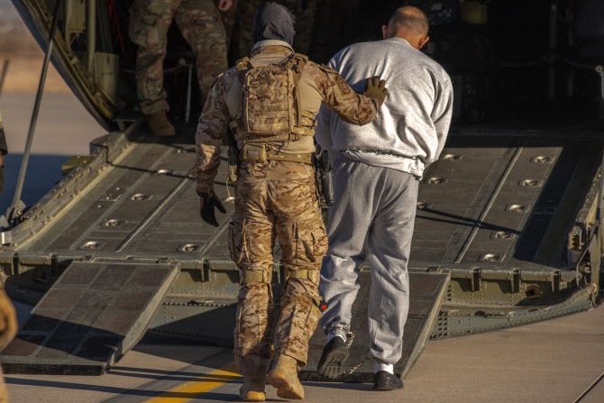 미국 이민세관단속국이 미국 관세국경보호국과 협력해 8일(현지시간) 텍사스주 포트 블리스 빅스 육군 비행장에서 불법 이민자 추방을 지원하고 있다.(사진=AFP) |