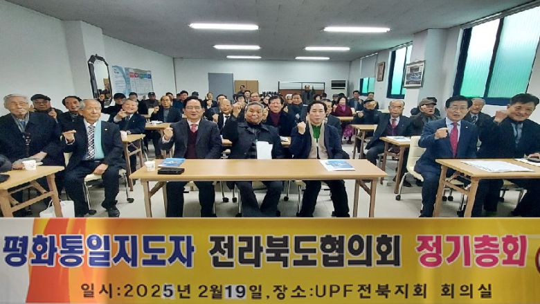 평화통일지도자 전북협의회는 19일 전주시 덕진구 전북UPF 회의실에서 2025년도 정기총회를 개최하고 신통일한국을 위한 평화통일 운동에 앞장설 것을 결의했다. 이날 총회에는 김희수·정병수 공동 회장을 비롯한 주요 임원, 회원 등 60여명이 참석했다.