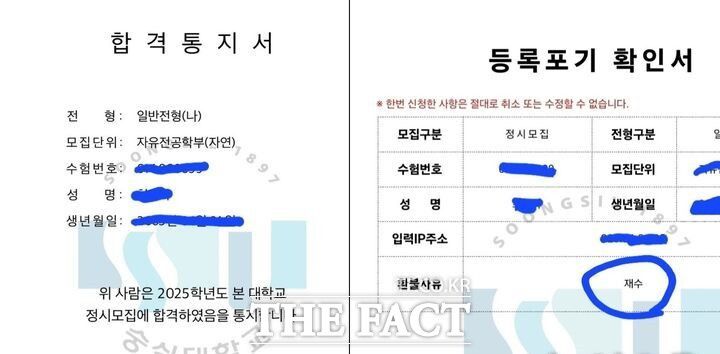 숭실대 합격통지서(좌측)와 등록포기 확인서(우측)의 모습. /뉴시스 |