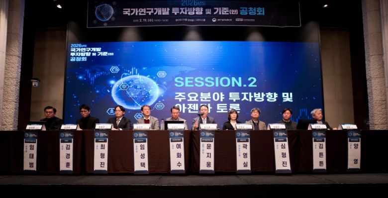 과학기술정보통신부와 한국과학기술기획평가원이 19일 오후 서울 서초구 엘타워에서 '2026년도 국가연구개발 투자방향 및 기준(안) 공청회' 를 개최했다. 사진은 (왼쪽부터) 임태범 한국전자기술연구원 본부장, 김경훈 카카오 리더, 최형진 서울대 교수, 임성택 OCIpower 본부장, 여화수 한국과학기술원 교수, 윤지웅 과학기술정책연구원장(좌장), 곽영실 천문연구원 책임연구원, 심형진 서울대 교수, 김튼튼 울산대 교수, 양영 숙명여대 교수. |